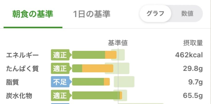 一方、プロティン1食分を追加するだけで、摂取カロリーとPFCバランスはちょうど良い結果となりました👍