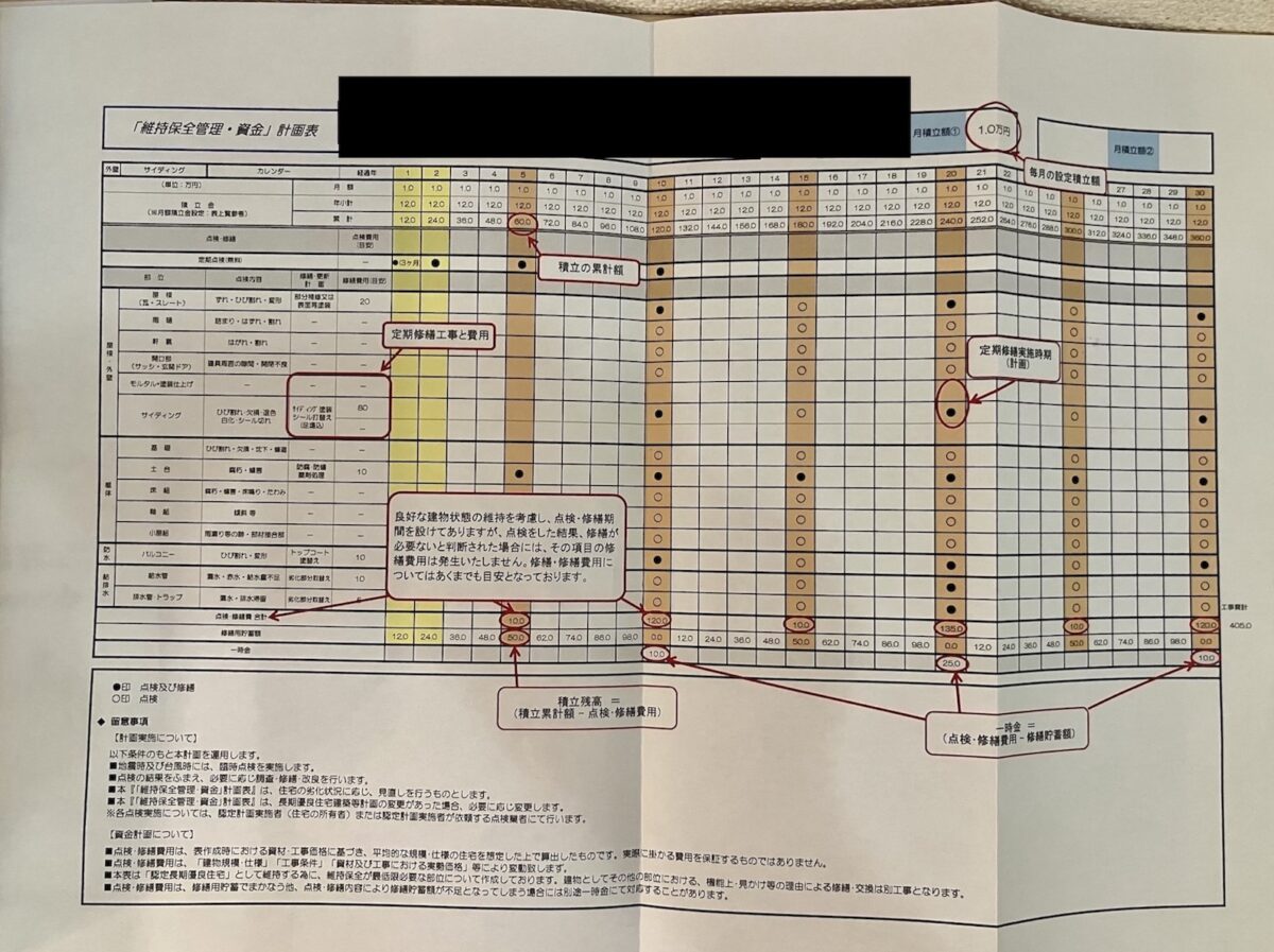 左の写真は私がブルーミングガーデンの建売一戸建てを購入した際に住宅メーカーから受け取った「維持・保全資金計画表」です。