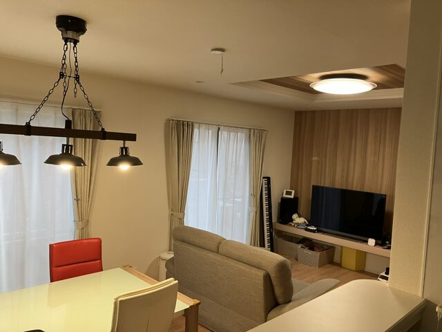 日当たりの悪さは、部屋の明るさと寒さに影響が出ますが、真っ暗なわけではありませんし「照明をつければ問題なし!」と極めてシンプルです。夏場になると日当たり抜群のお隣宅(別区画のブルーミングガーデン)では掃き出し窓に簾(すだれ)をかけて遮光しており、室内の明るさは我が家とおそらく大差ありません。