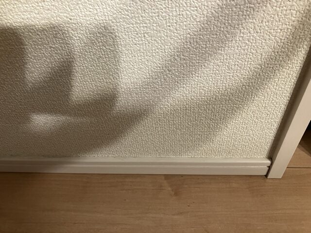 内装壁の一番下に付いている細長い板を「巾木(はばき)」といいますが、一箇所だけ剥がれが発生しました。木工用ボンドで接着後は今のところ剥がれは再発していません。