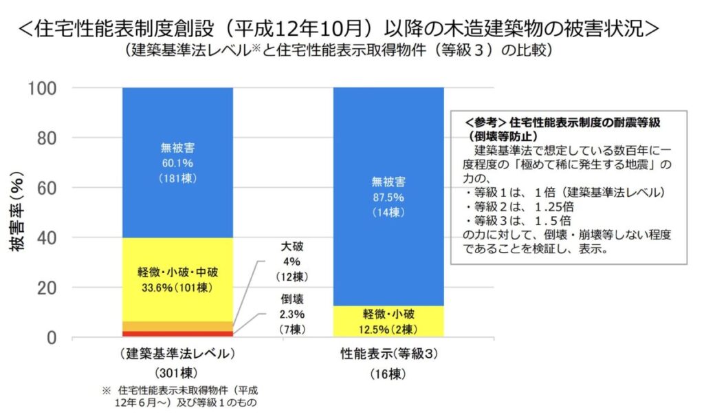 2016年4月に発生した熊本地震では震度7を記録しており、その際の耐震等級3の建物に対する下記データがあります。震度7で倒壊率は0%、一部損は12.5%程度であった様です。