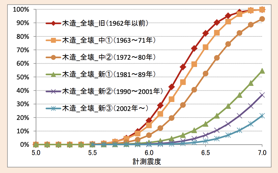 一方、震度7ともなると木造の耐震等級3といえど、全壊20%程度と想定されている下記のようなデータもあります。想定モデルによって予測確率は変わる様です。
